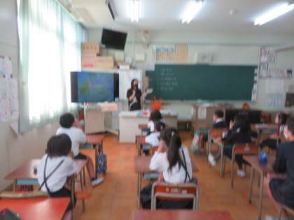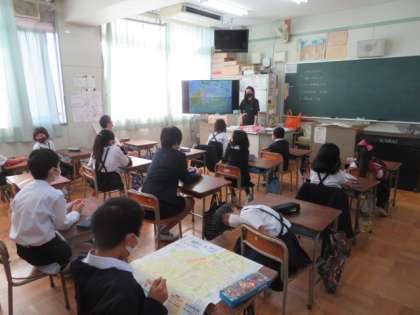 3・4・5・6年は、大型モニターに映したパワーポイント資料をもとにハザードマップを確認しています。