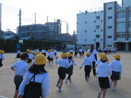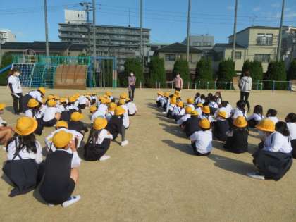 無事に一次避難場所に集まった1・2年の子どもたちに、避難の様子について話がありました。