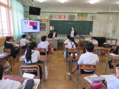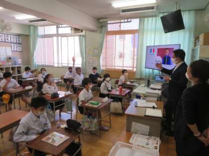 5年1組では、2組の担任がC-NETの先生と連携して、生き生きとした英語の授業を展開していました。