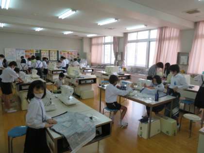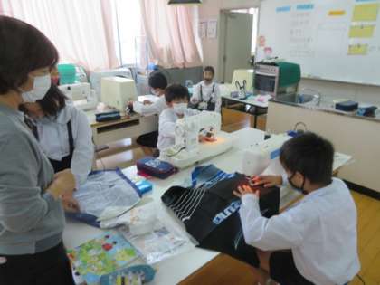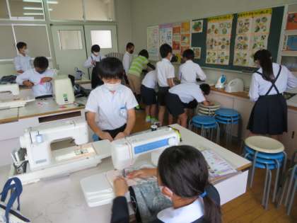 新型コロナウイルスによる影響で、5年生も今、ミシンを使ってエプロン作りをしています。