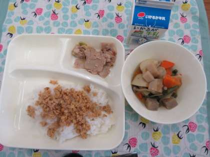 献立は、豚肉のねぎ醤油焼き、ふきよせ煮、ツナ大豆そぼろ、ごはん、牛乳でした。
