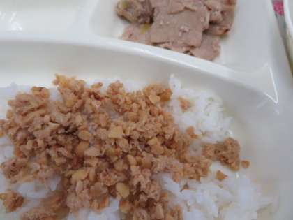 ツナ大豆そぼろは、ごはんにかけていただきます。しょうがが隠し味、風味付けになっており、ごはんによく合ってとてもおいしくいただきました。