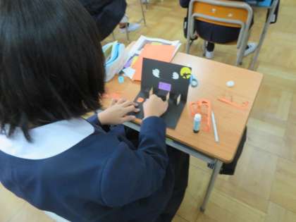 1組では、クランクを使ったおもちゃを仕上げた子どもから、ハロウィンのポップアップカードにチャレンジしていました。