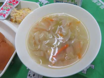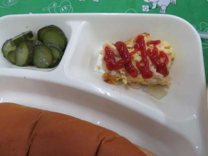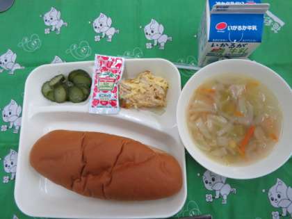 献立は、ツナポテトオムレツ、スープ、きゅうりのバジル風味サラダ、黒糖パン、牛乳でした。