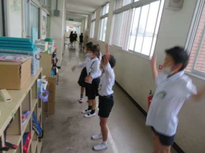 通りかかった2組の子どもが、廊下で一緒に踊りだしました。