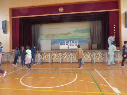 21日の土曜学習参観での「学習発表会」に向けて、5年生児童が講堂の体育用具を運び出したり、椅子出しをしたりしました。