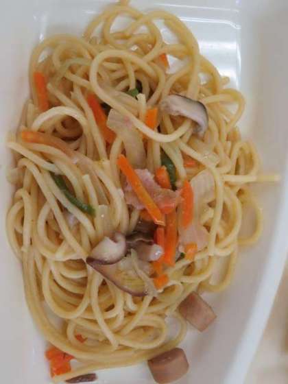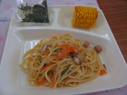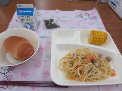 献立は、ウィンナーときのこのしょうゆ風味スパゲッティ、きざみのり、焼きとうもろこし、2分の1黒糖パンでした。