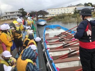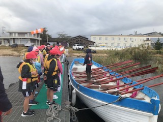 カッター漕艇に乗船するにあたっての説明を聞いています。