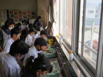 洗い終えて、各班ごとにテーブルを囲んで席につきました。