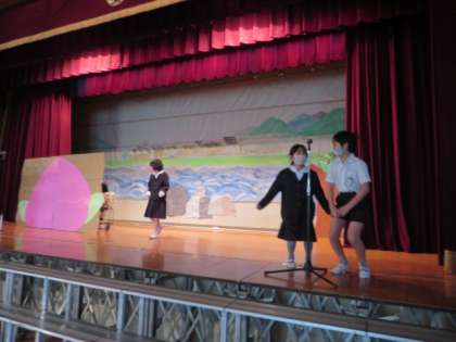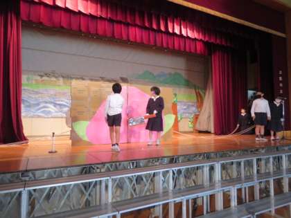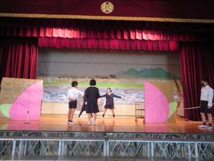 講堂で、英語劇「MOMOTROU」の舞台稽古をしていました。