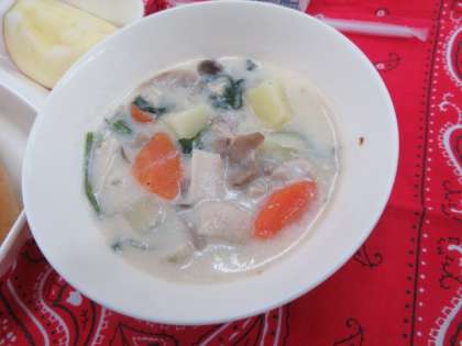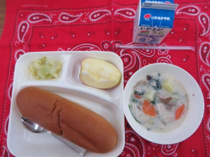 献立は、きのこのクリームシチュー、キャベツのピクルス、りんご、黒糖パン、牛乳でした。