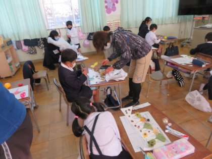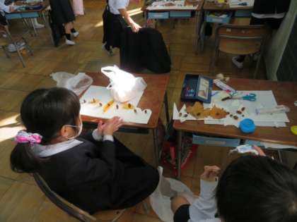 午前中に拾ってきたドングリや落ち葉を使って、王冠つくりを楽しんでいました。