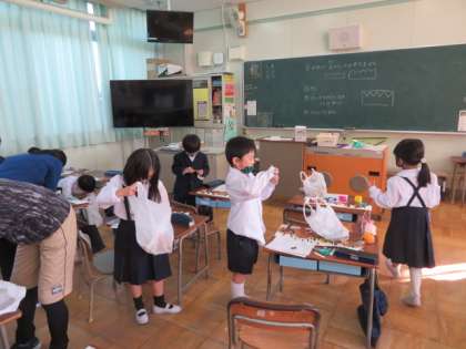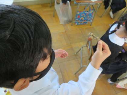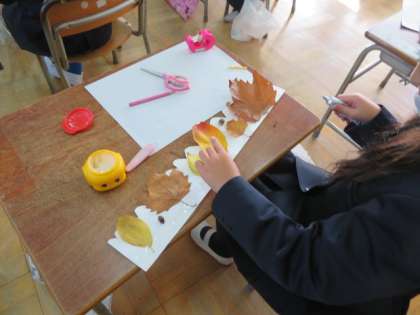 お互いに見せ合ったり、ドングリや落ち葉を交換したりして、自分が持ったイメージに近づけるように工夫を重ねていました。