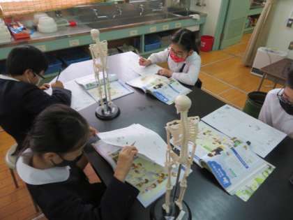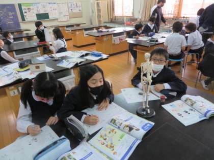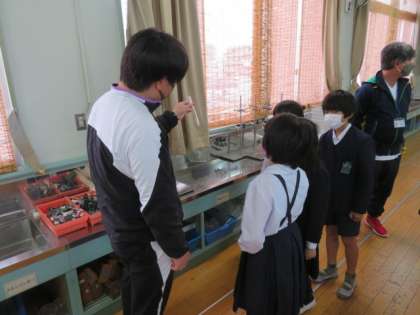 理科室の使い方や注意について、班ごとに理科室にある器具・用具などを確かめながら学習していました。