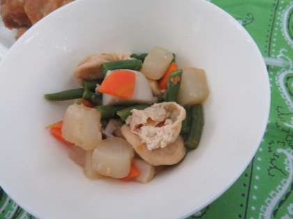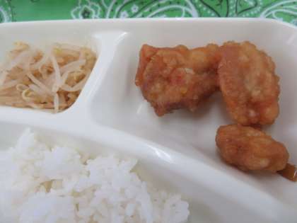 献立は、揚げ鳥のねぎだれかけ、含め煮、もやしのピリ辛あえ、ごはん、牛乳でした。