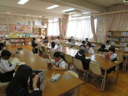 1組は、教室と図書室に分かれて学習をしていましたが、担任の先生がいない図書室で子どもたちは読書に集中していました。
