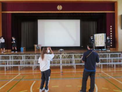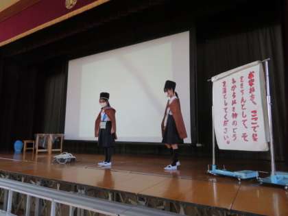 学習発表会で発表する国語で学習した宮沢賢治の「注文の多い料理店」の舞台稽古をしていました。