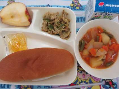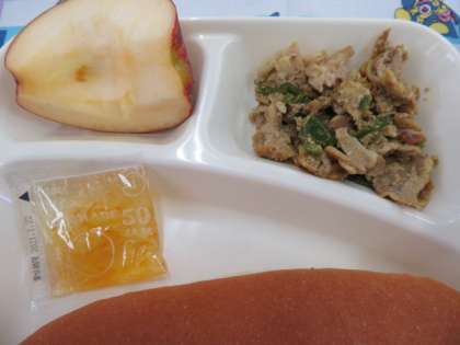 今日の献立は、豚肉のカレー風味焼き、ケチャップ煮、りんご、マーマレード、コッペパン、牛乳でした。