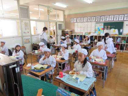 子どもたちは、給食をいただきながら静かに興奮していました。