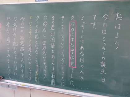 朝の時間に6年1組教室をのぞくと、黒板に今日がミッキーマウスの誕生日であること、そしてミッキーの名前の由来とウォルト ディズニーの世界の子どもたちに向けた願いについて書かれてありました。