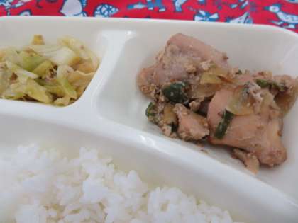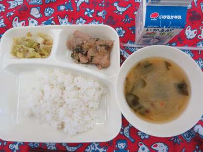 献立は、鶏肉のごまだれ焼き、なめこのみそ汁、キャベツの炒め物、ごはん、牛乳でした。
