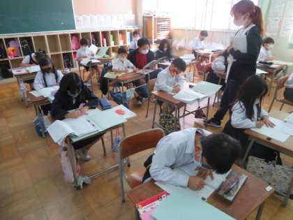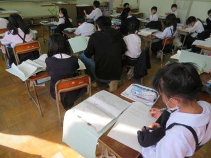 2組は、はじめ なか おわり それぞれに書く内容を要約したメモをもとに、用紙に書いているところでした。