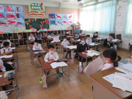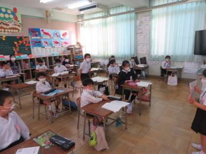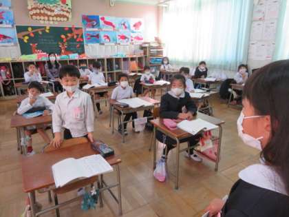 1組は、「わたしのたからもの」の作文を一人ひとりが前に出て発表していました。