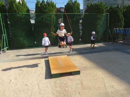 休み時間には、多くの子どもたちが縄跳びを楽しんでいます。