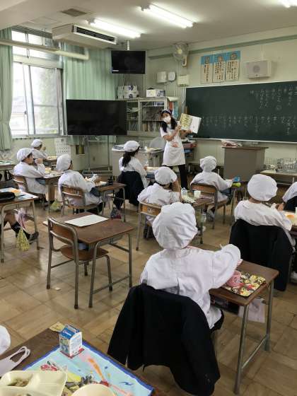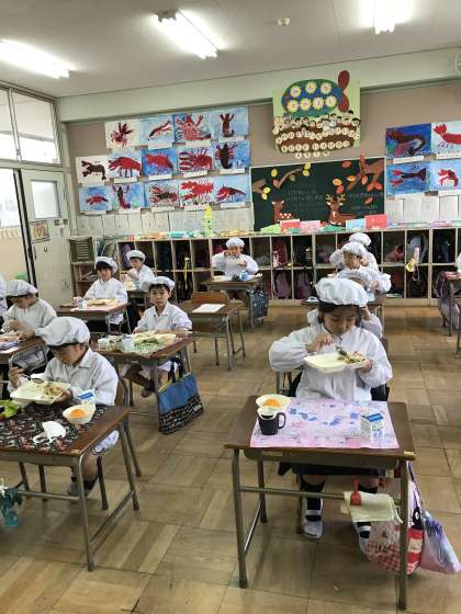 2年1組の給食時間は担任の先生の絵本の読み聞かせがあります。みんな真剣です。