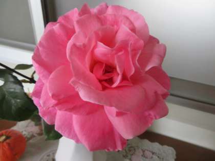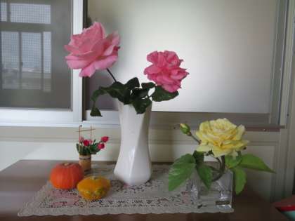 プール近くのバラが見事な花を咲かせていたようで、教職員が切り取ってみんなによく観ていただこうと校長室前靴箱の上に活けてくれました。