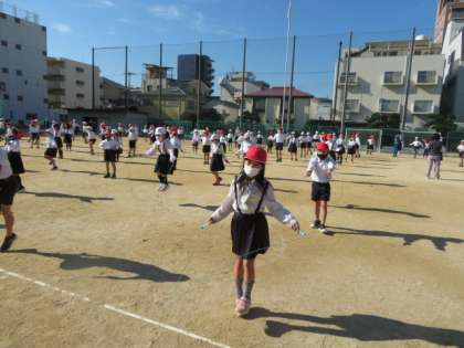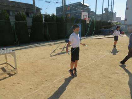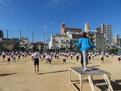 運動委員会の子どもや指揮台の上では先生がお手本となって、なわとびをしていました。