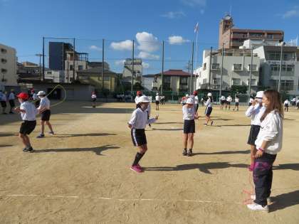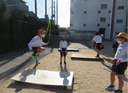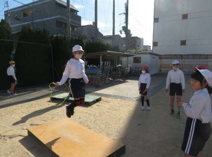 高学年の業間なわとびが終わり、残りの休み時間でも、ジャンピングボードが置いてあるところでなわとびにチャレンジしていました。