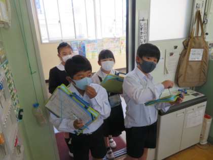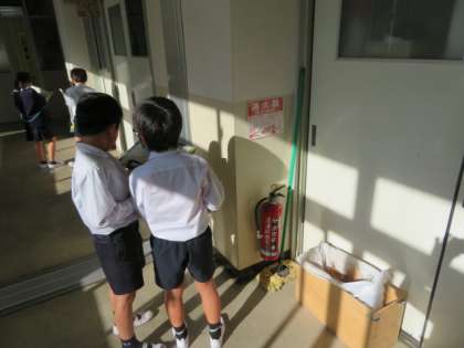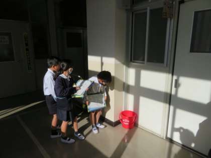 今日は、1組の子どもたちが校内をまわって、防災に関わるものについて確かめていました。