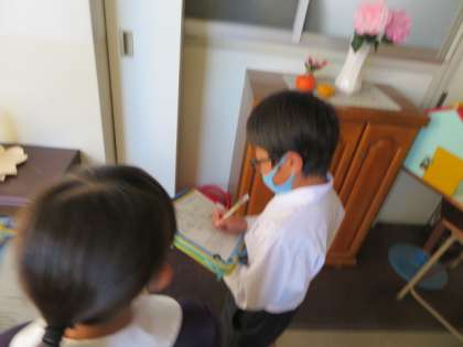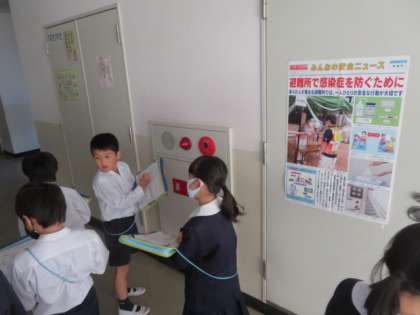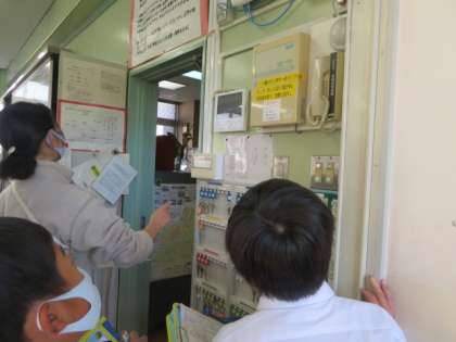 職員室では、教頭先生が防犯、防災に関わる器具の説明をしていました。