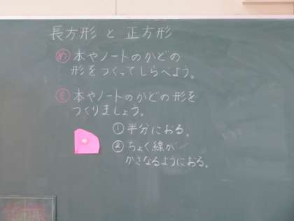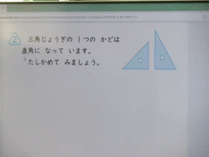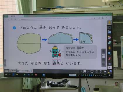 大型モニターや黒板、実際に紙を折ったり、切ったりしながら半具体物や具体物の操作を通して、図形の直角について学んでいます。