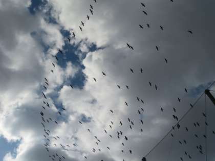 なわとびにチャレンジしている途中で、鶏の大群が上空を通過しました。