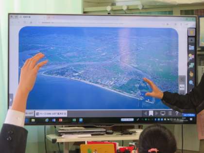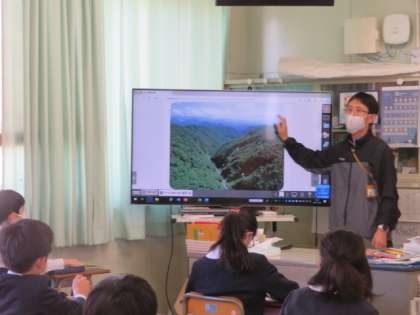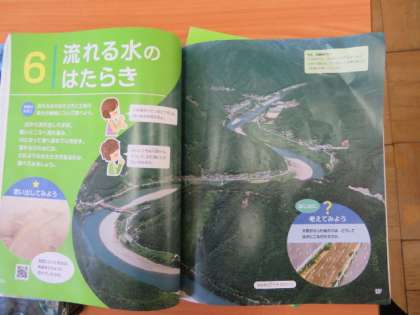 「流れる水のはたらき」を学んでいました。大型テレビに映し出された写真を見て、その地形の名前とどういった水のはたらきからできたものなのかを考えていました。
