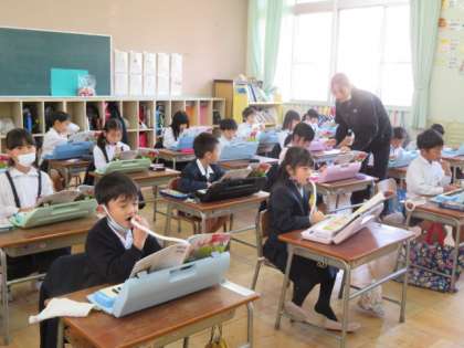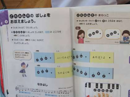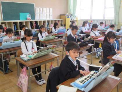 「なかよし」という曲をけんばんハーモニカの組と歌の組に分かれて演奏していました。けんばんハーモニカの演奏はどんどんうまくなってきました。