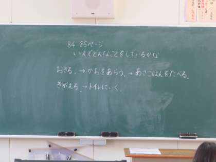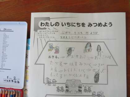 2組は、同じ生活科の学習ですが、「じぶんのいちにちをみつめよう」ということで教科書やワークシートをもとに自分の一日を振り返る活動をしていました。