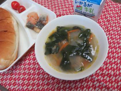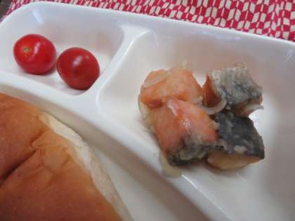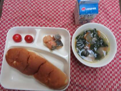献立は、さけのマリネ、肉団子と麦のスープ、プチトマト、おさつパン、牛乳でした。