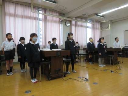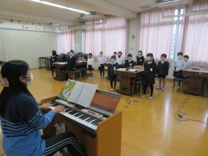 音楽室で、ディスタンスに気をつけて歌唱指導を行っていました。