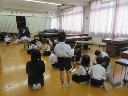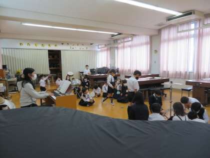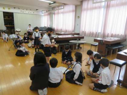 「いろいろながっきの音をかさねてえんそうしましょう」ということで、子どもたちがあつかえる楽器を選んで、「かぼちゃ」の曲を演奏しました。