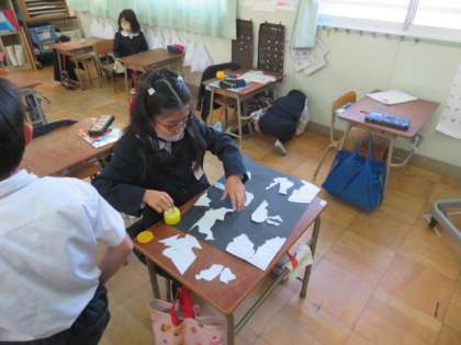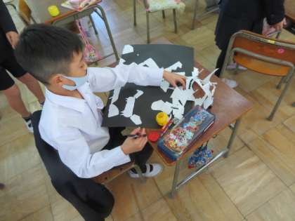 黒い画用紙に自由に切った白い紙を貼っていきながら、何に見えるかイメージをふくらませて作品として仕上げていました。