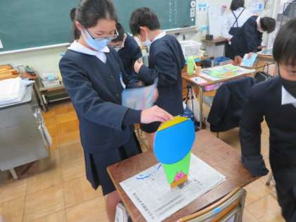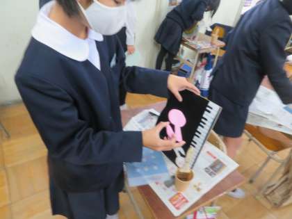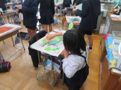 5年2組は、先日来図画工作で板を切ってお知らせボードを作成しています。今日は着色とニス塗りなど、仕上げの活動を行っていました。