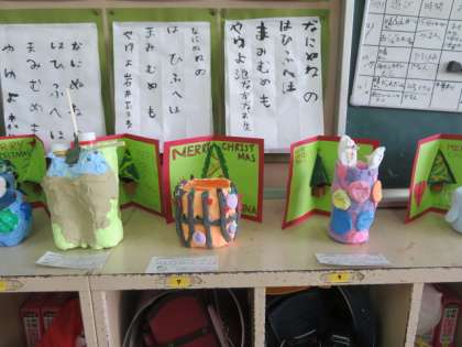 教室後ろには、クリスマスカードや廃材と紙粘土で作った置物が飾られていました。