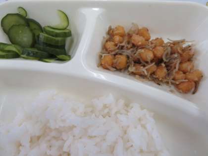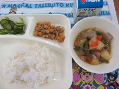 献立は、鶏肉と野菜の煮物、じゃこ豆、あっさりきゅうり、ごはん、牛乳でした。