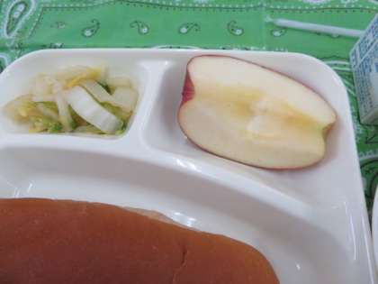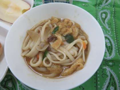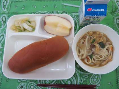 献立は、カレーうどん、白菜のおひたし、りんご、黒糖パン、牛乳でした。