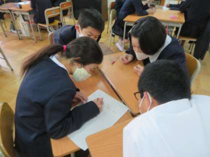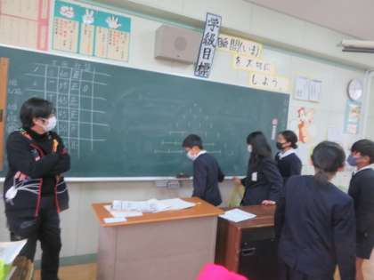 国語、算数、理科、社会に関わるクイズを班対抗でしていました。