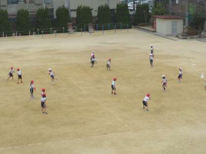 1組と同じ、途中でオニにタグを取られないように宝の球をゴールまで運ぶオニ遊びのゲームを楽しんでいました。