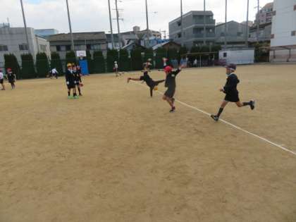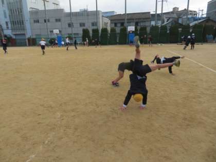 運動場で、ロンダートにチャレンジしている子どもがいました。